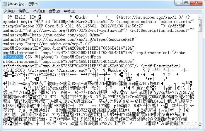 最簡(jiǎn)單的方法,自然就是直接看文件頭了。例如一張圖片是在 PS 中修改過(guò)、然后保存的,那么用記事本開(kāi)啟這張圖片,就可以在它的文件頭中,找到 “Photoshop”的字樣,如下圖所示。