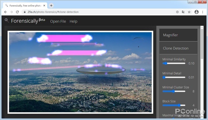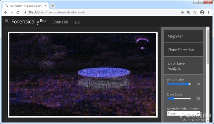 例如,F(xiàn)orensically 的 “Error Level Analysis”功能,可以突出顯示某些肉眼看上去差不多、但從計(jì)算機(jī)角度來(lái)看非常突兀的像素。例如這張示例圖中的飛碟,就很顯眼了,這明顯就是 P 上去的。